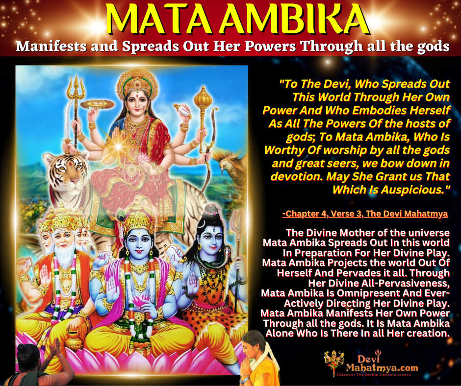 The Divine Mother of the universe Mata Ambika Spreads Out In this world In Preparation For Her Divine Play. Mata Ambika Projects the world Out Of Herself And Pervades it all. Through Her Divine All-Pervasiveness, Mata Ambika Is Omnipresent And Ever-Actively Directing Her Divine Play. Mata Ambika Manifests Her Own Power Through all the gods. It Is Mata Ambika Alone Who Is There In all Her creation.