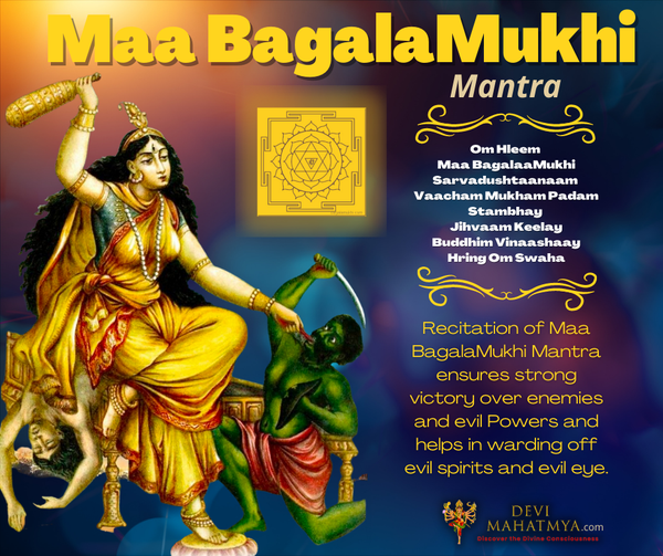 Recitation of Maa BagalaMukhi Mantra ensures strong victory over enemies and evil powers and helps in warding off evil spirits and evil eye.