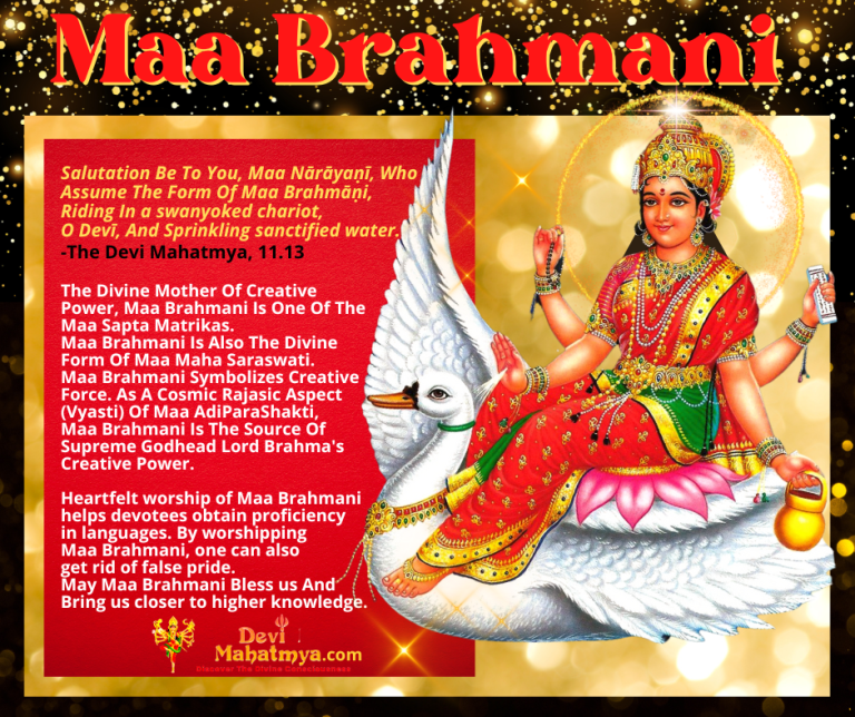 The Divine Mother Of Creative Power, Maa Brahmani Is One Of The Maa Sapta Matrikas. Maa Brahmani Is Also The Divine Form Of Maa Maha Saraswati. Maa Brahmani Symbolizes Creative Force. As A Cosmic Rajasic Aspect (Vyasti) Of Maa AdiParaShakti, Maa Brahmani Is The Source Of Supreme Godhead Lord Brahma’s Creative Power.