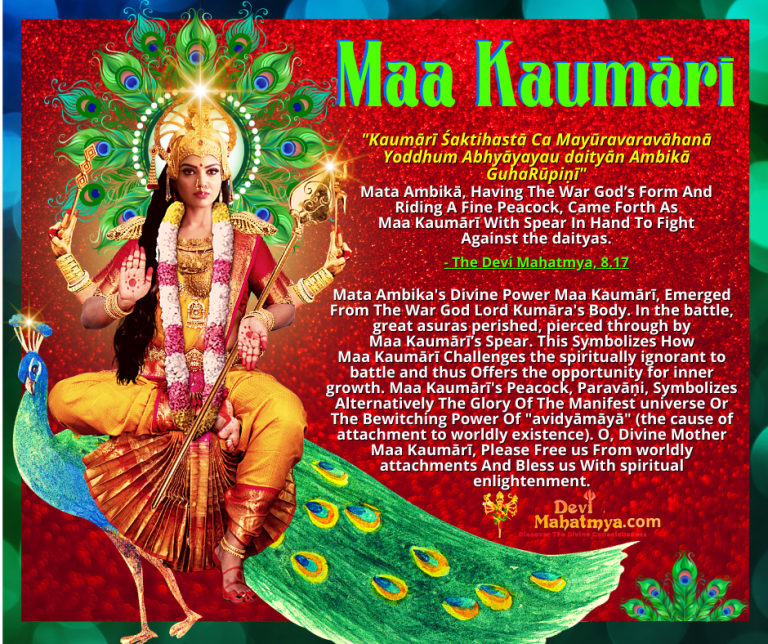 Mata Ambikā, Having The War God’s Form And Riding A Fine Peacock, Came Forth As Maa Kaumārī With Spear In Hand To Fight Against the daityas.