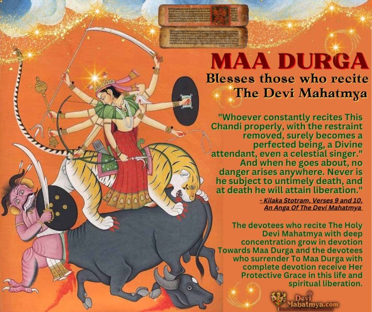 The devotees who recite The Holy Devi Mahatmya with deep concentration grow in devotion Towards Maa Durga and the devotees who surrender To Maa Durga with complete devotion receive Her Protective Grace in this life and spiritual liberation.
