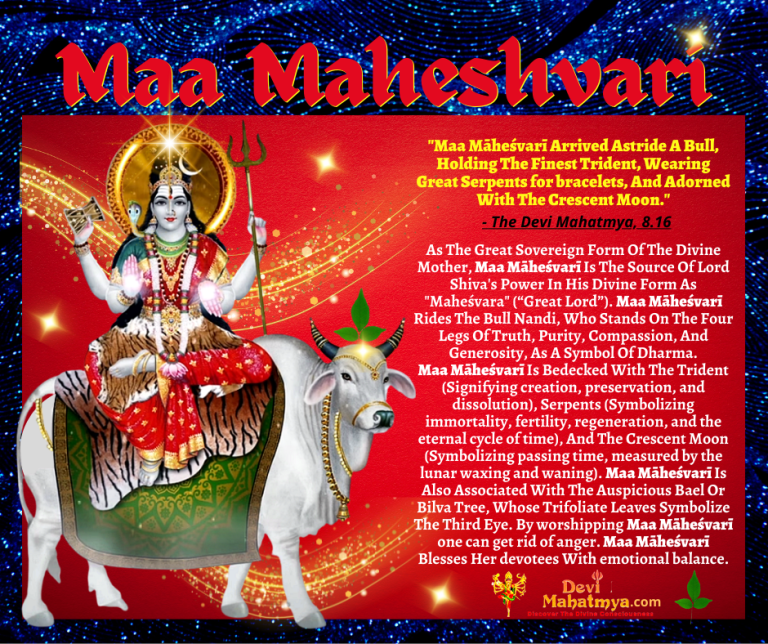 As The Great Sovereign Form Of The Divine Mother, Maa Māheśvarī Is The Source Of Lord Shiva’s Power In His Divine Form As “Maheśvara” (“Great Lord”). Maa Māheśvarī Rides The Bull Nandi, Who Stands On The Four Legs Of Truth, Purity, Compassion, And Generosity, As A Symbol Of Dharma.
