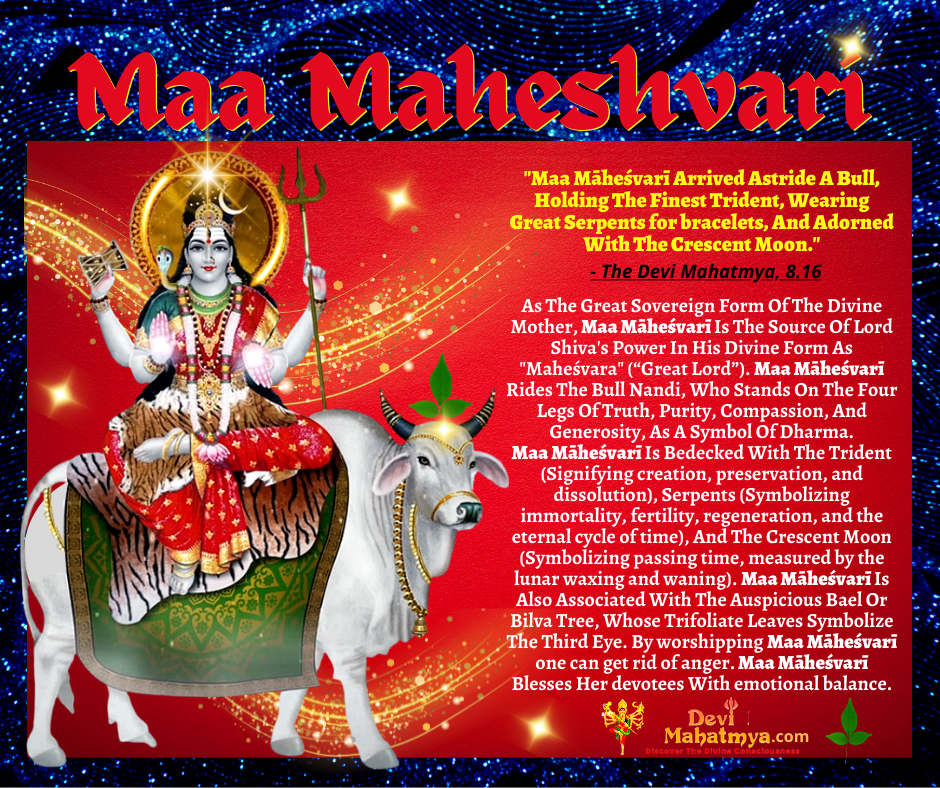 “Maa Māheśvarī Arrived Astride A Bull, Holding The Finest Trident, Wearing Great Serpents for bracelets, And Adorned With The Crescent Moon.”