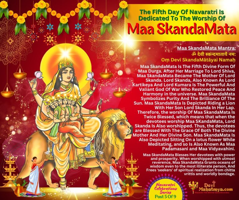 Maa SkandaMata Is The Fifth Divine Form Of Maa Durga. After Her Marriage To Lord Shiva, Maa SkandaMata Became The Mother Of Lord Skanda. Lord Skanda, Also Known As Lord Kartikeya And Lord Kumara Is The Powerful And Valiant God Of War Who Restored Peace And Harmony in the universe. Maa SkandaMata Symbolizes Purity And The Brilliance Of The Sun. Maa SkandaMata Is Depicted Riding a Lion With Her Son Lord Skanda In Her Lap. Therefore, the worship Of Maa SkandaMata Is Twice Blessed, which means that when the devotees worship Maa SKandaMata, Lord Skanda Is Also worshipped. Thus, the devotees are Blessed With The Grace Of Both The Divine Mother And Her Divine Son. Maa SkandaMata Is Also Depicted Sitting On a lotus flower While Meditating, and so Is Also Known As Maa Padamasani and Maa Vidyavahini.