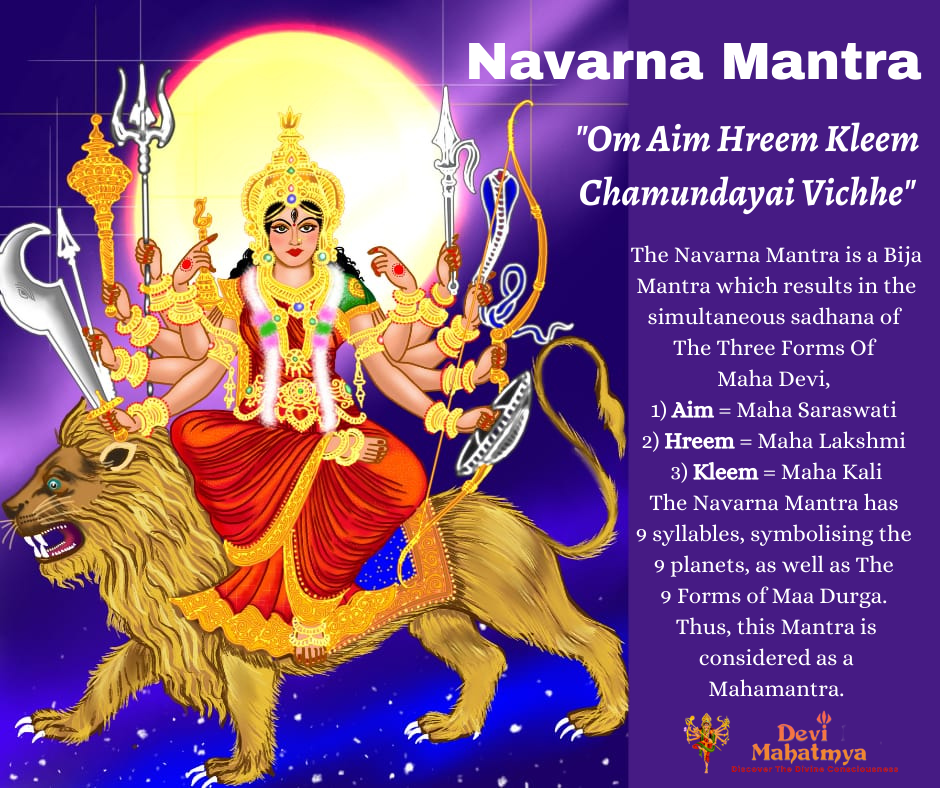 “Om Aim Hreem Kleem Chamundayai Vichhe” The Navarna Mantra is a Bija Mantra which results in the simultaneous sadhana of The Three Forms Of Maha