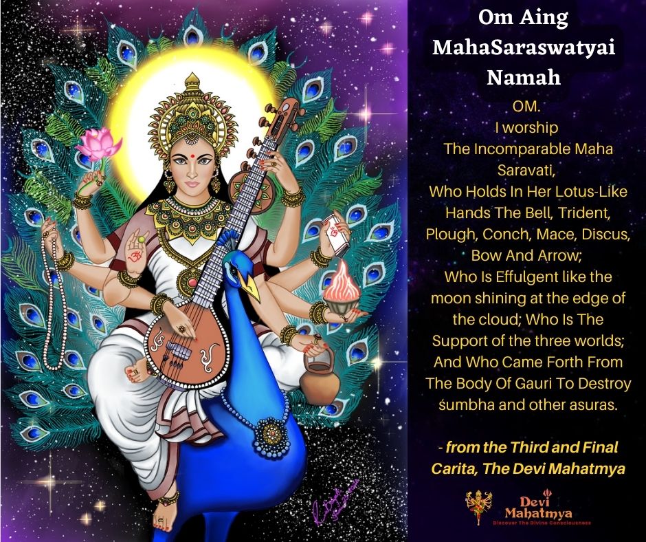 OM.I worshipThe Incomparable Maha Saravati,Who Holds In Her Lotus-Like Hands The Bell, Trident, Plough, Conch, Mace, Discus, Bow And Arrow;Who Is Effulgent like the moon