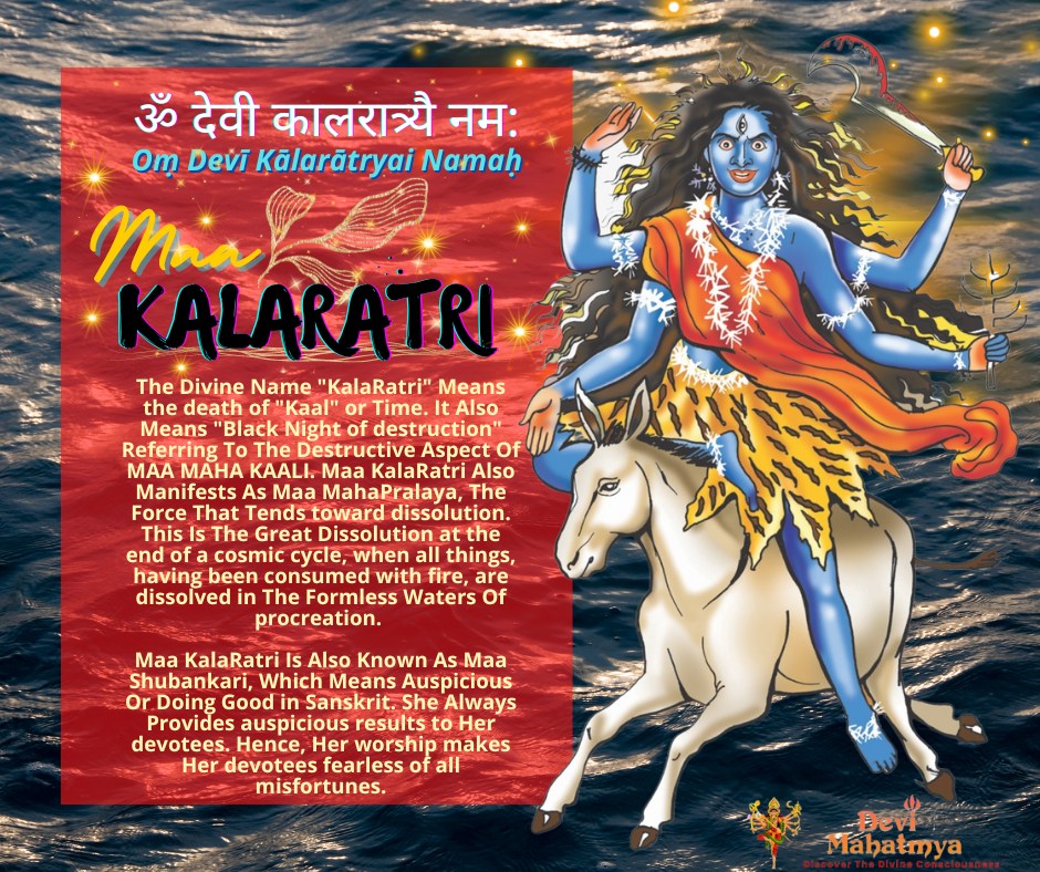 เฅ เคฆเฅเคตเฅ เคเคพเคฒเคฐเคพเคคเฅเคฐเฅเคฏเฅ เคจเคฎ:Oแน Devฤซ Kฤlarฤtryai Namaแธฅ ๐๐๐ ๐๐๐๐๐ก๐๐ฃ๐ก๐ The Divine Name “KalaRatri” Means the death of “Kaal” or Time. It Also Means “Black Night