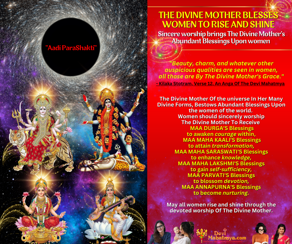 𝐓𝐡𝐞 𝐃𝐢𝐯𝐢𝐧𝐞 𝐌𝐨𝐭𝐡𝐞𝐫 𝐁𝐥𝐞𝐬𝐬𝐞𝐬 𝐰𝐨𝐦𝐞𝐧 𝐭𝐨 𝐫𝐢𝐬𝐞 𝐚𝐧𝐝 𝐬𝐡𝐢𝐧𝐞 Sincere worship brings The Divine Mother’s Abundant Blessings Upon women “Beauty, charm, and whatever other auspicious