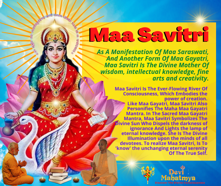 ๐๐๐ ๐๐๐๐๐๐๐ As A Manifestation Of Maa Saraswati, And Another Form Of Maa Gayatri, Maa Savitri Is The Divine Mother Of wisdom, intellectual knowledge, fine