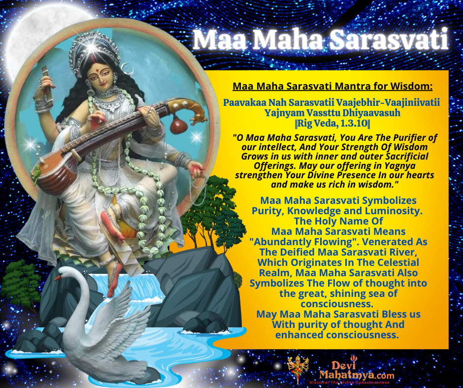 ๐๐๐ ๐๐๐ก๐ ๐๐๐ซ๐๐ฌ๐ฏ๐๐ญ๐ข Maa Maha Sarasvati Mantra for Wisdom: Paavakaa Nah Sarasvatii Vaajebhir-Vaajiniivatii Yajnyam Vassttu Dhiyaavasuh ||Rig Veda, 1.3.10|| “O Maa Maha Sarasvati, You Are