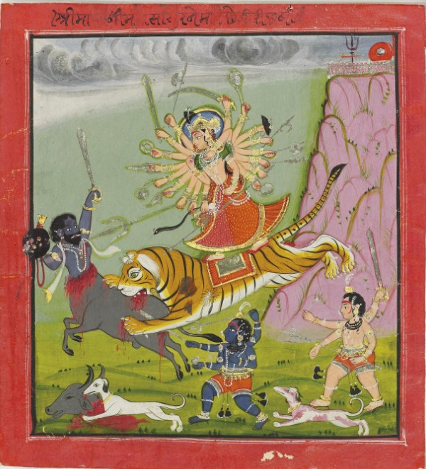 3.21 While his army thus met destruction, Mahiṣāsura terrified the Devī’s hosts with his own buffalo form,