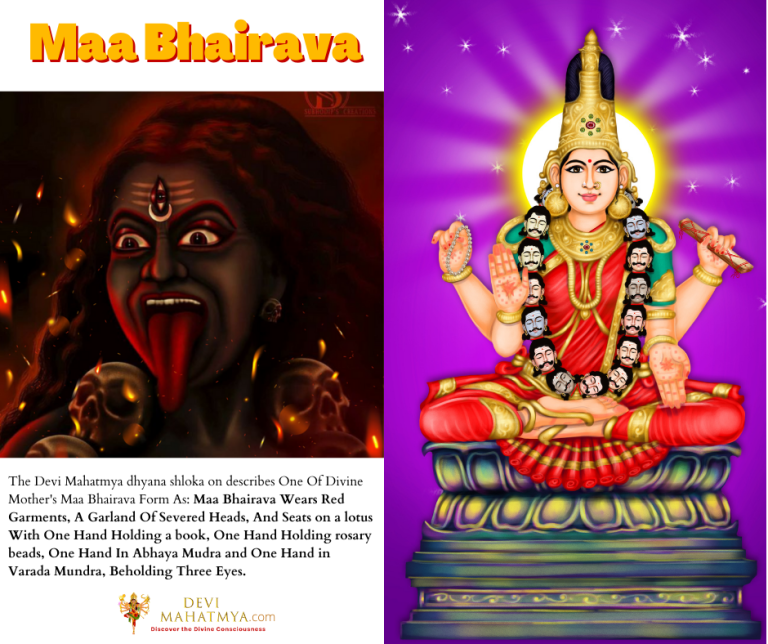 The Devi Mahatmya dhyana shloka describes One Of Divine Mother’s Maa Bhairava Form As: Maa Bhairava Wears Red Garments, A Garland Of Severed Heads, And Seats on a lotus With One Hand Holding a book, One Hand Holding rosary beads, One Hand In Abhaya Mudra and One Hand in Varada Mudra, Beholding Three Eyes.