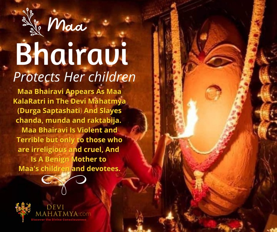 Maa Bhairavi Appears As Maa KalaRatri in The Devi Mahatmya (Durga Saptashati) And Slays chanda, munda and raktabija.