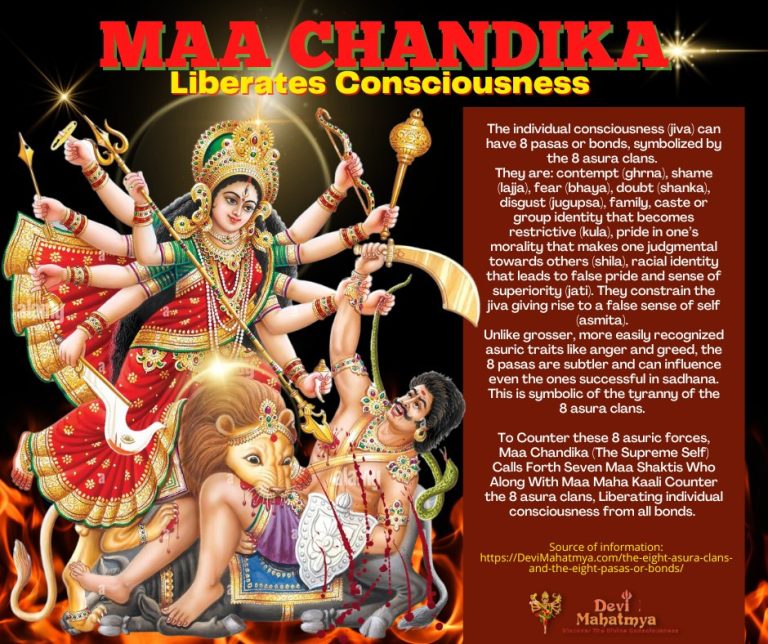 To Counter these 8 asuric forces, Maa Chandika (The Supreme Self) Calls Forth Seven Maa Shaktis Who Along With Maa Maha Kaali Counter the 8 asura clans, Liberating individual consciousness from all bonds.