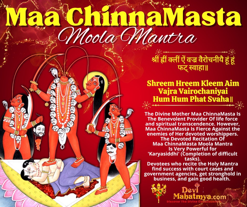 The Divine Mother Maa ChinnaMasta Is The Benevolent Provider Of life force and spiritual transcendence. However, Maa ChinnaMasta Is Fierce Against the enemies of Her devoted worshippers. The Devoted Recitation Of Maa ChinnaMasta Moola Mantra