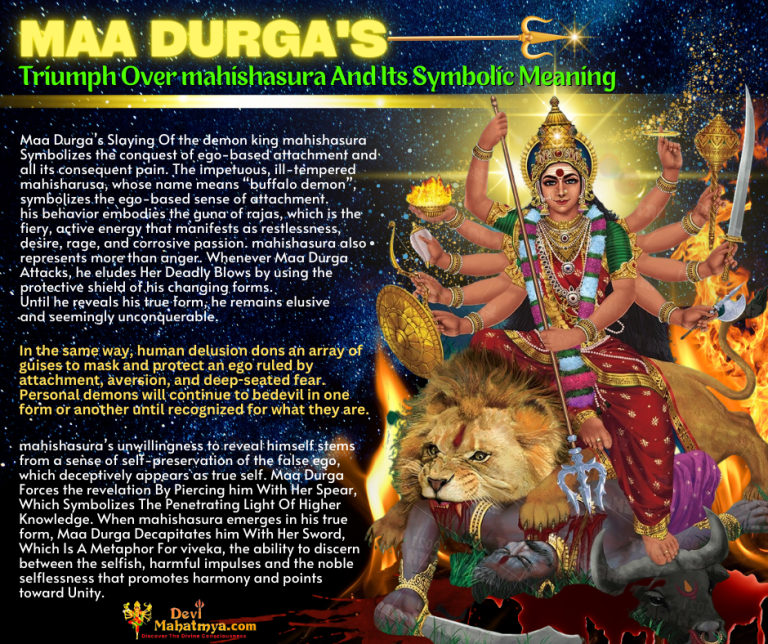 Maa Durga’s Slaying Of the demon king mahishasura Symbolizes the conquest of ego-based attachment and all its consequent pain. The impetuous, ill-tempered mahisharusa, whose name means “buffalo demon”, symbolizes the ego-based sense of attachment.