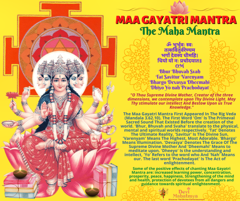 The Maa Gayatri Mantra First Appeared In The Rig Veda (Mandala 3.62.10). The First Word ‘Om’ Is The Primeval Sacred Sound That Existed Before the creation of the world. ‘Bhur, Bhuvah and Svaha’ translate to the physical, mental and spiritual worlds respectively. ‘Tat’ Denotes The Ultimate Reality, ‘Savitur’ Is The Divine Sun, ‘Varenyam’ Means The Highest, Most Adorable. ‘Bhargo’ Means Illumination. ‘Devasya’ Denotes The Grace Of The Supreme Divine Mother And ‘Dheemahi’ Means to meditate upon. ‘Dheeyo’ Is the understanding and intellect, ‘Yo’ Refers to the word who And ‘Nah’ Means our. The last word ‘Prachodayat’ Is The Act of enlightenment.