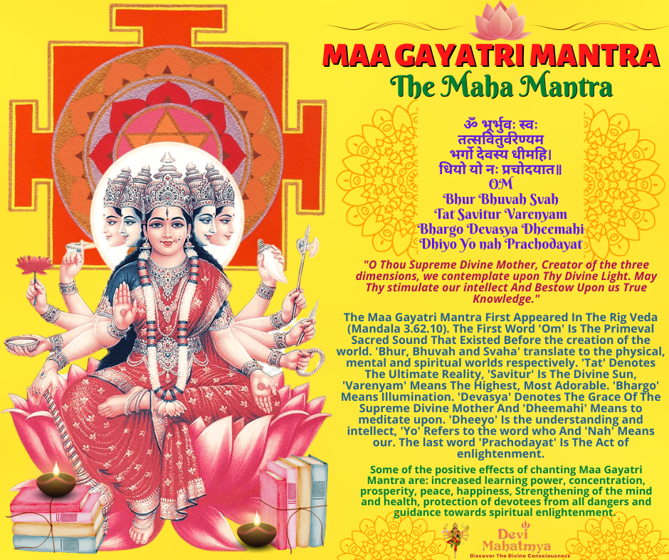 “O Thou Supreme Divine Mother, Creator of the three dimensions, we contemplate upon Thy Divine Light. May Thy stimulate our intellect And Bestow Upon us True Knowledge.”