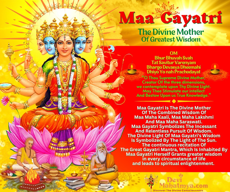 Maa Gayatri Is The Divine Mother Of The Combined Wisdom Of Maa Maha Kaali, Maa Maha Lakshmi And Maa Maha Saraswati. Maa Gayatri Symbolizes The Incessant And Relentless Pursuit Of Wisdom. The Divine Light Of Maa Gayatri’s Wisdom Is Symbolized By The Light of The Sun. The continuous recitation Of The Great Gayatri Mantra, Which Is Inhabited By Maa Gayatri Herself Grants greater wisdom in every circumstance of life and leads to spiritual enlightenment.