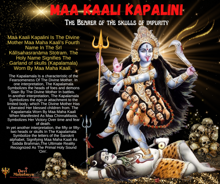 Maa Kaali Kapalini Is The Divine Mother Maa Maha Kaali’s Fourth Name In The ΕrΔ« KΔlΔ«sahasranΔma Stotram. The Holy Name Signifies The Garland of skulls (Kapalamala) Worn By Maa Maha Kaali.