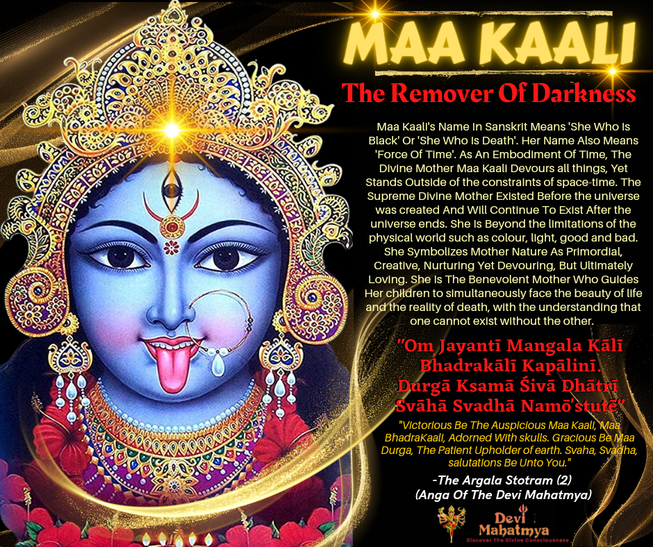 “Victorious Be The Auspicious Maa Kaali, Maa BhadraKaali, Adorned With skulls. Gracious Be Maa Durga, The Patient Upholder of earth. Svaha, Svadha, salutations Be Unto You.”