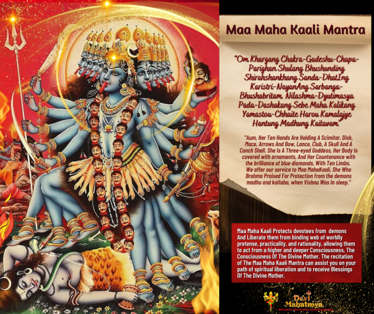 Maa Maha Kaali Protects devotees from demons And Liberates them from the binding web of worldly pretense, practicality, and rationality, allowing them to act from a higher and deeper Consciousness, The Consciousness Of The Divine Mother. The recitation of The Maa Maha Kaali Mantra can assist you on your path of spiritual liberation and to receive Blessings Of The Divine Mother.