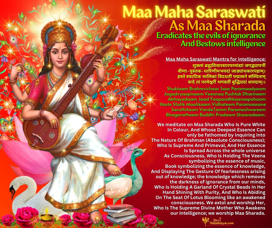We meditate on Maa Sharada Who Is Pure White In Colour, And Whose Deepest Essence Can only be fathomed by inquiring into The Nature Of Brahman (Absolute Consciousness); Who Is Supreme And Primeval, And Her Essence Is Spread Across the whole universe As Consciousness, Who Is Holding The Veena symbolizing the essence of music, Book symbolizing the essence of knowledge, And Displaying The Gesture Of fearlessness arising out of knowledge; the knowledge which removes the darkness of ignorance from our minds, Who Is Holding A Garland Of Crystal Beads In Her Hand Shining With Purity, And Who Is Abiding On The Seat Of Lotus Blooming like an awakened consciousness. We extol and worship Her, Who Is The Supreme Divine Mother Who Awakens our intelligence; we worship Maa Sharada.