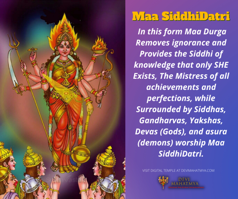 In this form Maa Durga Removes ignorance and Provides the Siddhi of knowledge that only SHE Exists, The Mistress of all achievements and perfections, while Surrounded by Siddhas, Gandharvas, Yakshas, Devas (Gods), and asura (demons) worship Maa SiddhiDatri.