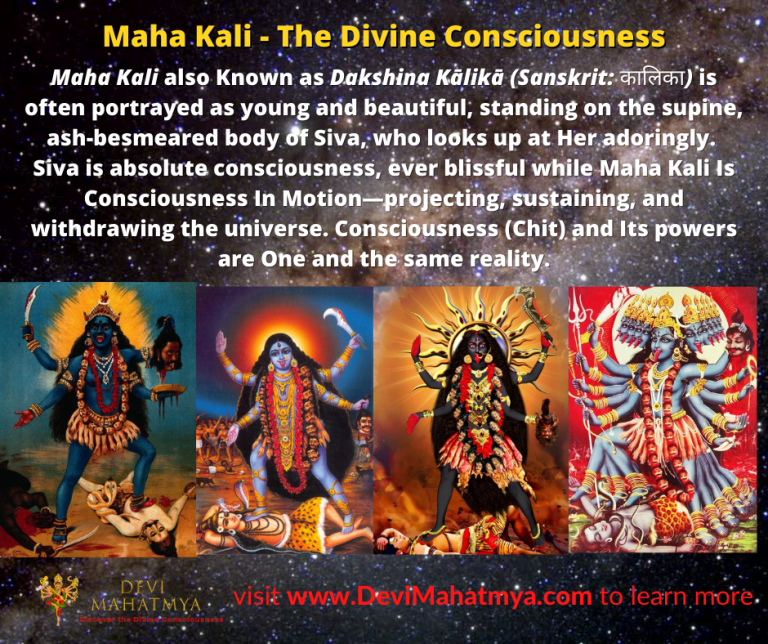 Maha Kali also Known as Dakshina Kālikā (Sanskrit: कालिका) is often portrayed as young and beautiful, standing on the supine, ash-besmeared body of Siva, who looks up at Her adoringly.
