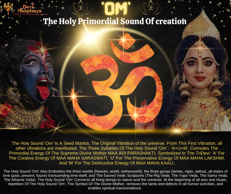 The Holy Sound ‘Om’ Is A Seed Mantra, The Original Vibration of the universe. From This First Vibration, all other vibrations are manifested. The Three Syllables Of The Holy Sound ‘Om’ – ‘A+U+M’, Connotes The Primordial Energy Of The Supreme Divine Mother MAA ADI PARASHAKTI, Symbolized In The TriDevi: ‘A’ For The Creative Energy Of MAA MAHA SARASWATI, ‘U’ For The Preservative Energy Of MAA MAHA LAKSHMI, And ‘M’ For The Destructive Energy Of MAA MAHA KAALI.