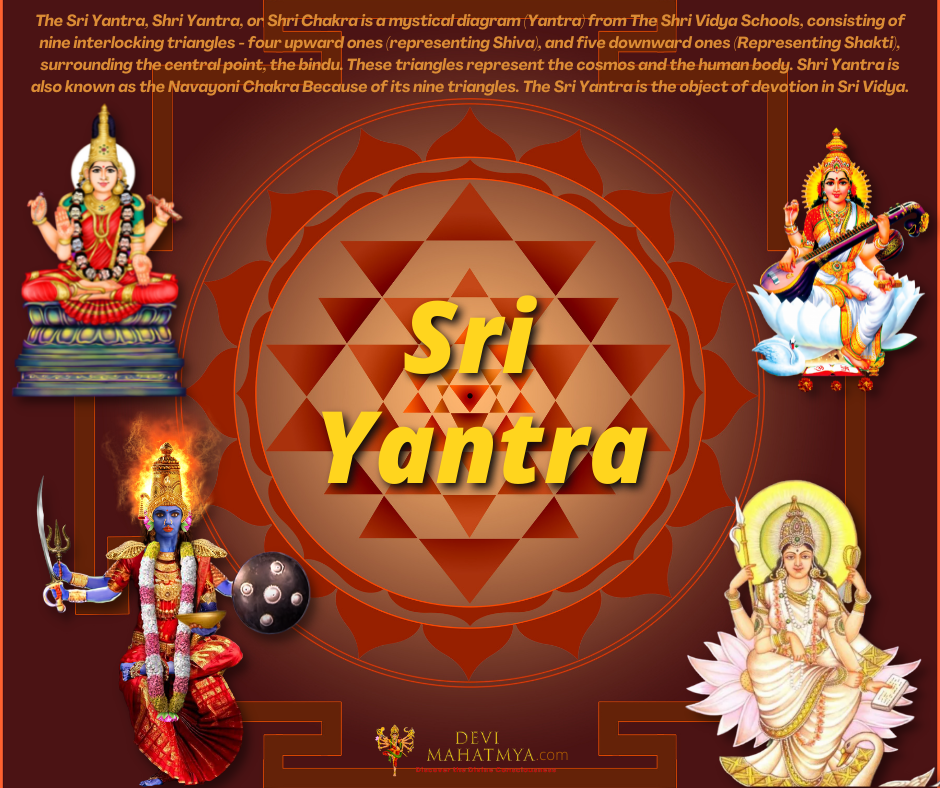 The Sri Yantra, Shri Yantra, or Shri Chakra is a mystical diagram (Yantra) from The Shri Vidya Schools, consisting of nine interlocking triangles – four upward ones (representing Shiva), and five downward ones (Representing Shakti), surrounding the central point, the bindu. These triangles represent the cosmos and the human body. Shri Yantra is also known as the Navayoni Chakra because of its nine triangles. The Sri Yantra is the object of devotion in Sri Vidya.