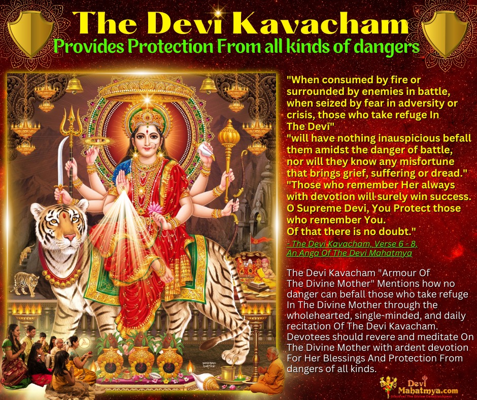 The Devi Kavacham “Armour Of The Divine Mother” Mentions how no danger can befall those who take refuge In The Divine Mother through the wholehearted, single-minded, and daily recitation Of The Devi Kavacham. Devotees should revere and meditate On The Divine Mother with ardent devotion For Her Blessings And Protection From dangers of all kinds.