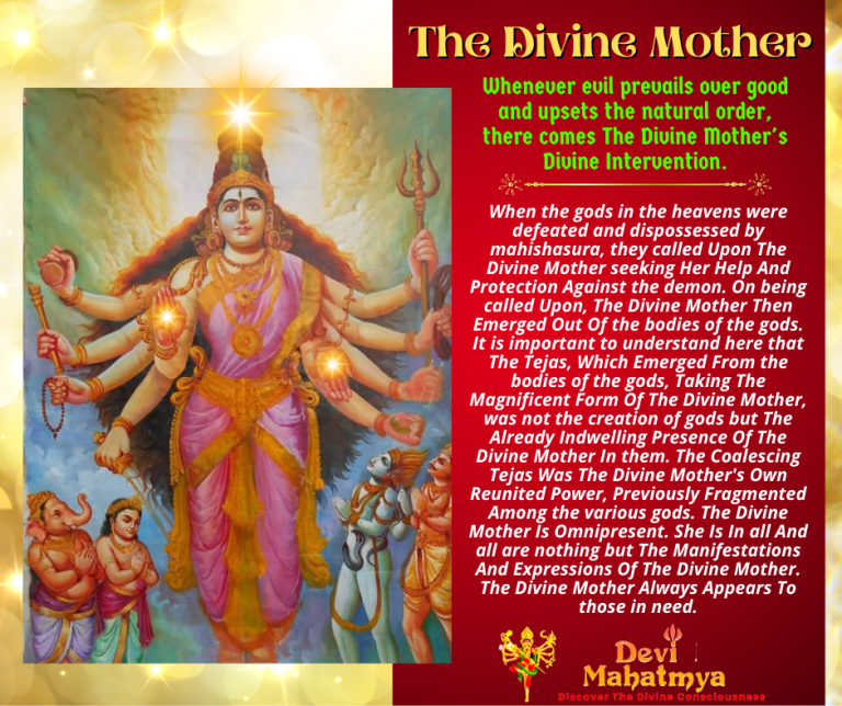 When the gods in the heavens were defeated and dispossessed by mahishasura, they called Upon The Divine Mother seeking Her Help And Protection Against the demon. On being called Upon, The Divine Mother Then Emerged Out Of the bodies of the gods. It is important to understand here that The Tejas, Which Emerged From the bodies of the gods, Taking The Magnificent Form Of The Divine Mother, was not the creation of gods but The Already Indwelling Presence Of The Divine Mother In them. The Coalescing Tejas Was The Divine Mother’s Own Reunited Power, Previously Fragmented Among the various gods. The Divine Mother Is Omnipresent. She Is In all And all are nothing but The Manifestations And Expressions Of The Divine Mother. The Divine Mother Always Appears To those in need.