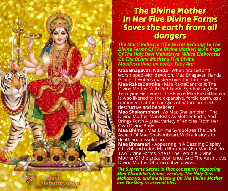 The Murti Rahasya (The Secret Relating To The Divine Forms Of The Divine Mother) Is An Anga Of The Holy Devi Mahatmya, Which Elaborates On The Divine Mother’s Five Divine Manifestations on earth. They Are: