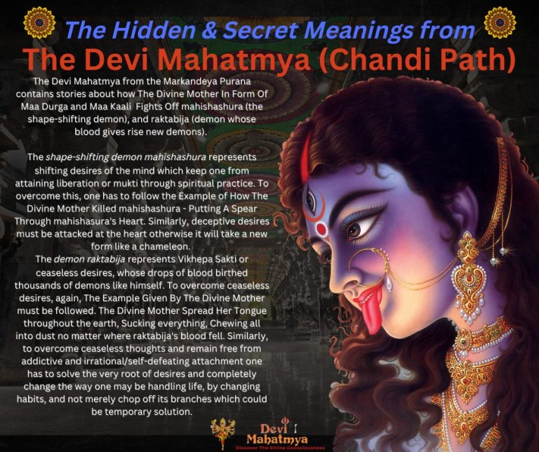 The demon raktabija represents Vikhepa Sakti or ceaseless desires, whose drops of blood birthed thousands of demons like himself. To overcome ceaseless desires, again, The Example Given By The Divine Mother must be followed. The Divine Mother Spread Her Tongue throughout the earth, Sucking everything, Chewing all into dust no matter where raktabija’s blood fell. Similarly, to overcome ceaseless thoughts and remain free from addictive and irrational/self-defeating attachment one has to solve the very root of desires and completely change the way one may be handling life, by changing habits, and not merely chop off its branches which could be temporary solution.