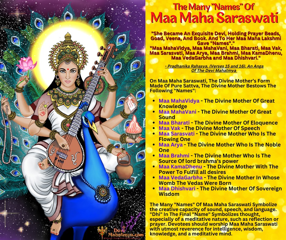 On Maa Maha Saraswati, The Divine Motherβs Form Made Of Pure Sattva, The Divine Mother Bestows The Following “Names”:
